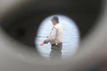 I landed it a little clumsily by grabbing it under the belly, and my friend Kim approached with a camera and shot a picture or two. As I was about to unhook the fish and release it, he handed me a neat hook release thingamajig, which I was to slide down the line over the hook and simply press out the fly. I liked the concept of having my soft office fingers well out of harms way. As the tool grabbed the fly, the pike wiggled violently and went one way, the fly another and the untethered tool described a nice arc, splashed into the water between the rocks and disappeared in the weed, never to bee seen again.